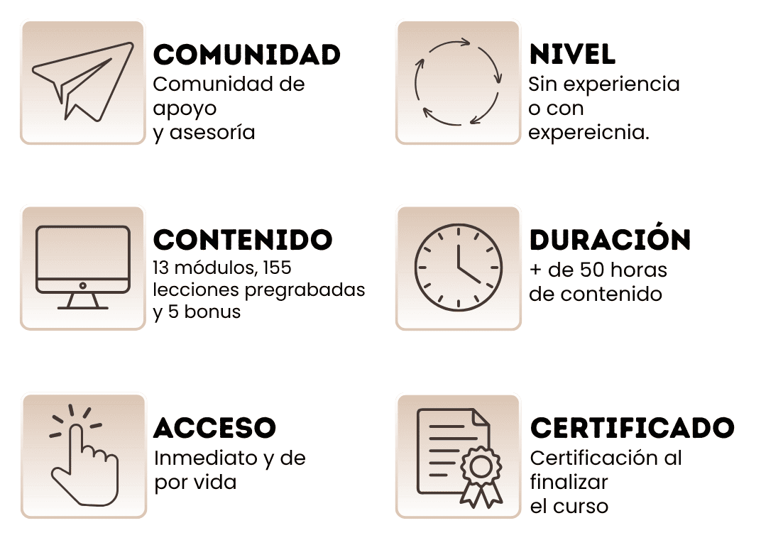 Para temas del curso, cuando ya seas miembro, también tendrás acceso a nuestro grupo privado para tener toda una comunidad dándote apoyo y soporte.